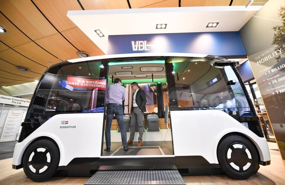 ?4月23日,人們?cè)诘聡?guó)漢諾威工博會(huì)上參觀一款無人駕駛汽車。新華社記者任鵬飛攝