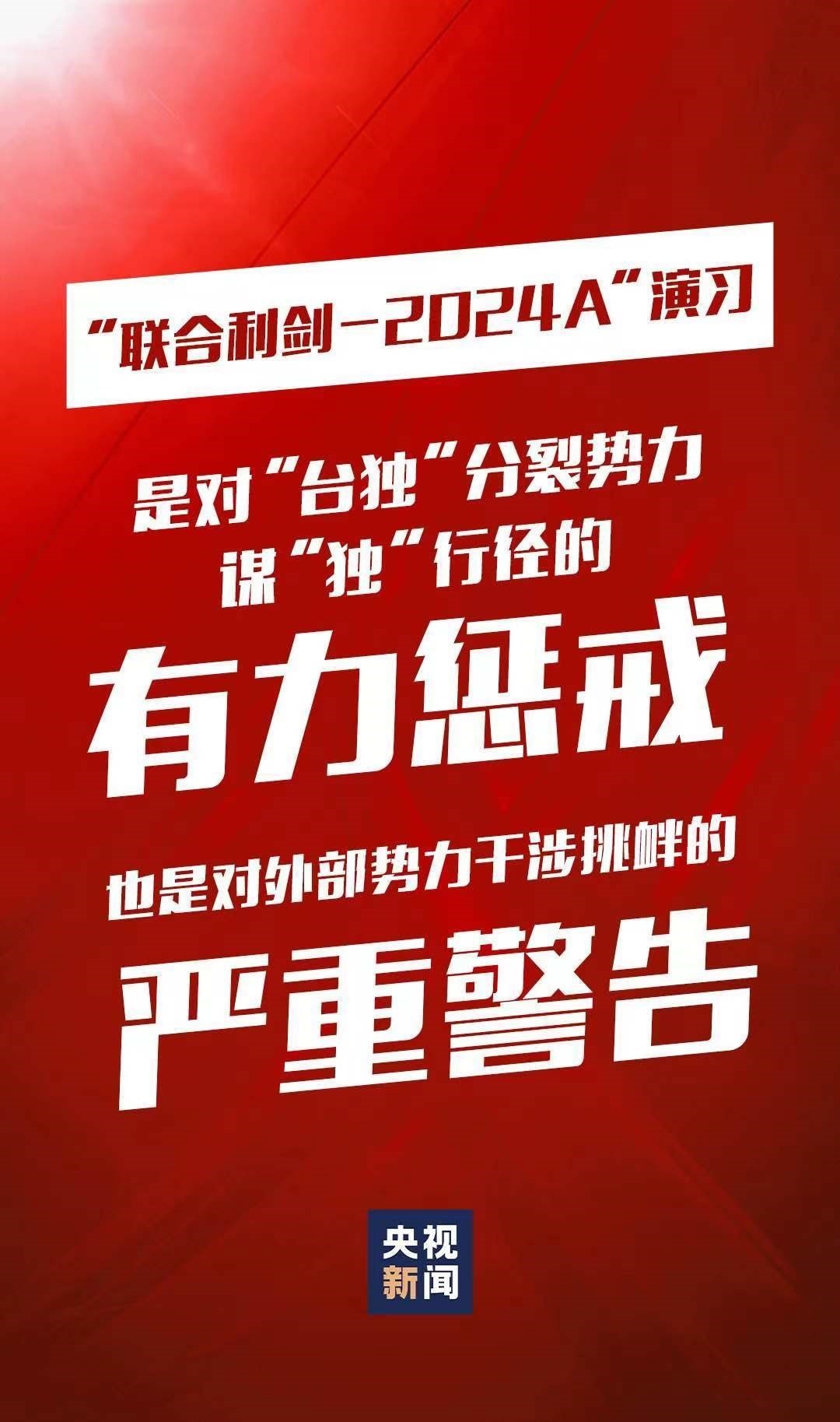 5月23日至24日,中國人民解放軍東部戰(zhàn)區(qū)組織戰(zhàn)區(qū)陸軍、海軍、空軍、火箭軍等兵力,位臺島周邊開展“聯(lián)合利劍-2024A”演習(xí),重點(diǎn)演練聯(lián)合??諔?zhàn)備警巡、聯(lián)合奪取戰(zhàn)場綜合控制權(quán)、聯(lián)合精打要害目標(biāo)等科目,艦機(jī)抵近臺島周邊戰(zhàn)巡,島鏈內(nèi)外一體聯(lián)動(dòng),檢驗(yàn)戰(zhàn)區(qū)部隊(duì)聯(lián)合作戰(zhàn)實(shí)戰(zhàn)能力。這是中國維護(hù)國家主權(quán)和領(lǐng)土完整的正義之舉,也是對“臺獨(dú)”分裂勢力謀“獨(dú)”行徑的有力懲戒,對外部勢力干涉挑釁的嚴(yán)重警告。