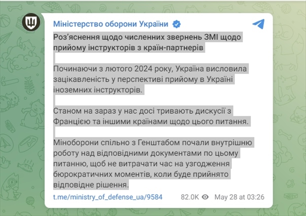 5月28日,烏克蘭國防部在Telegram上發(fā)文稱,到目前為止仍在就接受伙伴國教員一事,與法國和其他國家進(jìn)行討論。
