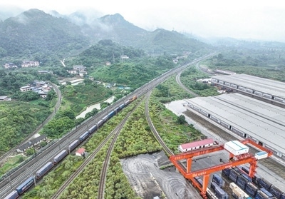 6月27日,西部陸海新通道中老泰馬跨境鐵路班列在重慶江津小南埡站發(fā)車(無人機照片)。該班列的開行將促進(jìn)通道沿線地區(qū)與東盟國家的經(jīng)貿(mào)合作和產(chǎn)業(yè)聯(lián)動。新華社記者 唐 奕攝