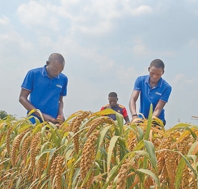 在中國—烏干達(dá)農(nóng)業(yè)合作產(chǎn)業(yè)園的試驗(yàn)田里,當(dāng)?shù)毓と苏谑斋@中國狐尾小米。龍文靖攝