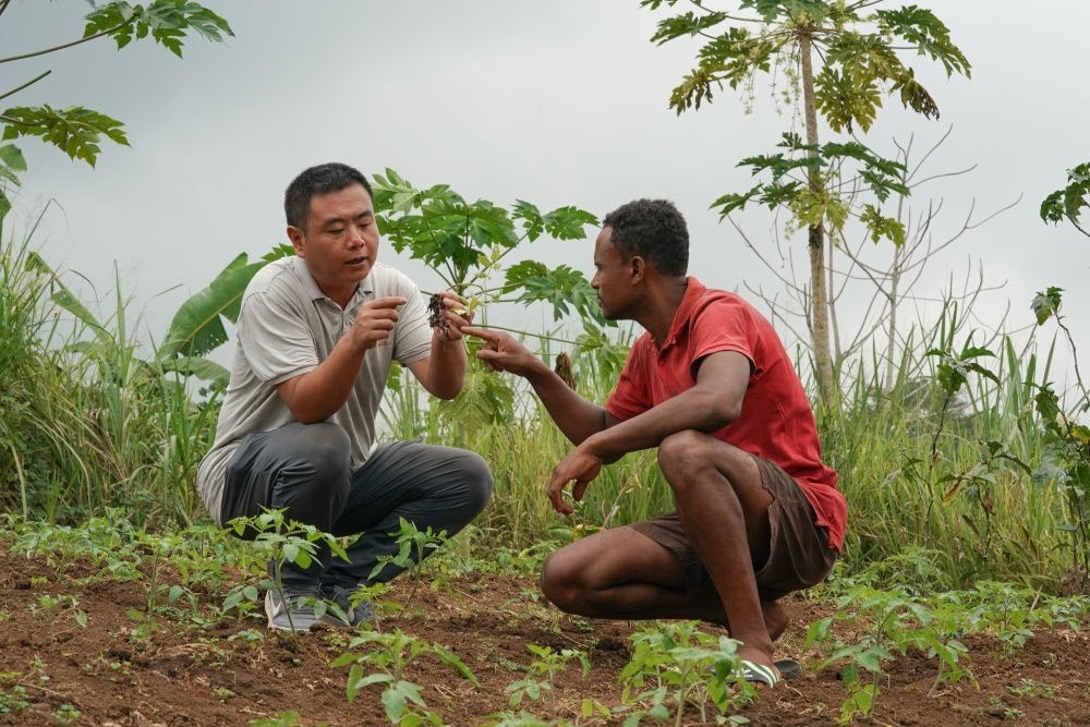 2023年7月15日,在圣多美和普林西比洛巴塔縣卡德拉斯村,中國援圣普農(nóng)牧業(yè)技術(shù)專家組專家許州達(dá)在田間指導(dǎo)農(nóng)戶努內(nèi)斯種植辣椒。中國援圣普農(nóng)牧業(yè)技術(shù)專家組與圣普農(nóng)業(yè)、漁業(yè)和農(nóng)村發(fā)展部合作,于2021年在圣普洛巴塔縣卡德拉斯村建立第一個中圣普農(nóng)業(yè)減貧示范村,并有效結(jié)合中國農(nóng)業(yè)技術(shù)和扶貧經(jīng)驗幫助當(dāng)?shù)剞r(nóng)民增產(chǎn)增收。