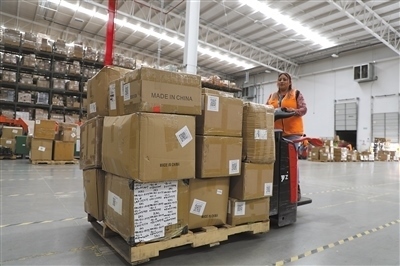 美獅集團墨西哥州海外倉內(nèi),一名員工從傳送帶取下貨物放到拖車上,準(zhǔn)備移動至智能上架區(qū)入庫。本報墨西哥分社 埃內(nèi)斯托·多明戈斯攝