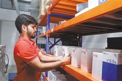 中國企業(yè)位于巴基斯坦的海外倉將中國制造的數(shù)碼產(chǎn)品等高附加值貨物快速配送至本地線下零售商網(wǎng)絡(luò),顯著提升效率和靈活性。圖為海外倉的送貨員正在與當(dāng)?shù)厣虘艚唤迂浳?。本報巴基斯坦分?賽義德·邁赫迪攝