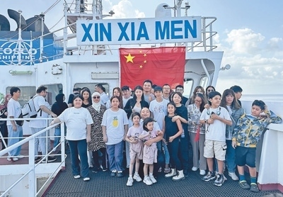 撤離人員在“新廈門號”輪上合影。外交部供圖