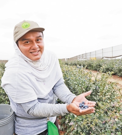 在秘魯特魯希略市一家農場里,一名采摘工人在展示他剛摘下的藍莓。本報記者 顏 歡攝