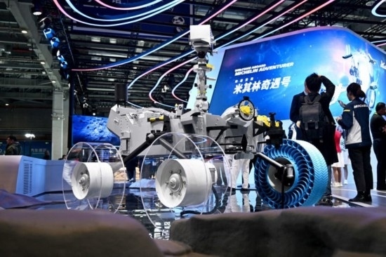 這是11月6日在第七屆進(jìn)博會(huì)汽車(chē)展區(qū)拍攝的在亞洲首次亮相的米其林月球探測(cè)車(chē)輪胎。新華社發(fā)(陳浩明 攝)