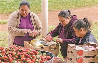 中國三峽巴西公司在位于巴西南部格利保吉水電站周邊開展創(chuàng)收創(chuàng)業(yè)試點(diǎn)項(xiàng)目。圖為當(dāng)?shù)剞r(nóng)戶正在分裝草莓。納塔利婭·弗洛爾攝