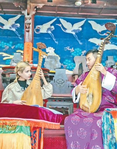 在一家漢服店,兩人興致勃勃地換上漢服,特意選擇了紅色,“感覺一下子就融入了古鎮(zhèn)氛圍”。在公共閱讀空間“鐘書房”,他們在老師的指導(dǎo)下,在紅紙上揮毫潑墨,學(xué)寫“福”字。喜歡爵士樂的他們隨身攜帶電吉他,看到有老師傅正在演奏二胡,便來到一旁即興合奏起來,中西方音樂的交融,吸引許多游客駐足喝彩。“親眼來看看中國,遠比電視上看到的更美,以后還要帶著朋友再來?!彼麄兊哪樕贤钢d奮。