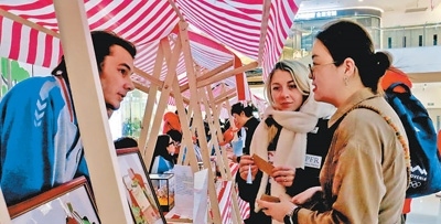 外國游客在北京延慶萬達廣場體驗市集。