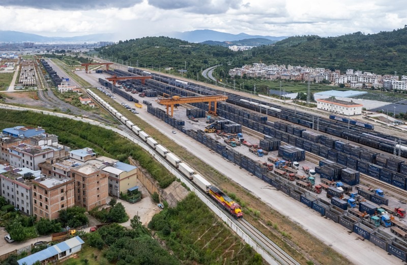 8月23日,前往老撾萬象的國際貨物列車駛出中老鐵路玉溪研和站。