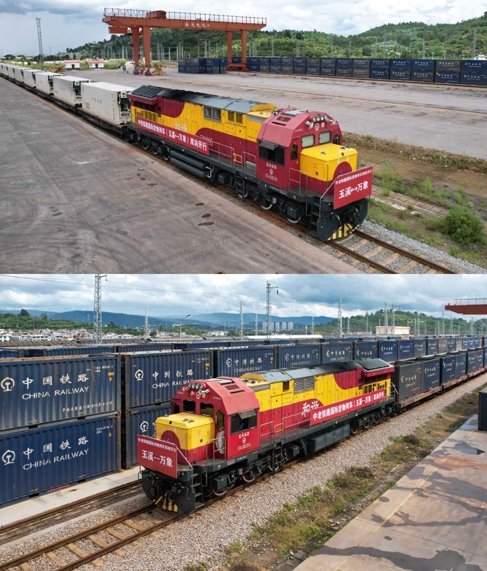 拼版照片:上圖是8月23日在中老鐵路玉溪研和站拍攝的準備發(fā)車前往老撾萬象的國際貨物列車(無人機照片);下圖是8月23日拍攝的從老撾萬象發(fā)車并已抵達中老鐵路玉溪研和站的國際貨物列車(無人機照片)。