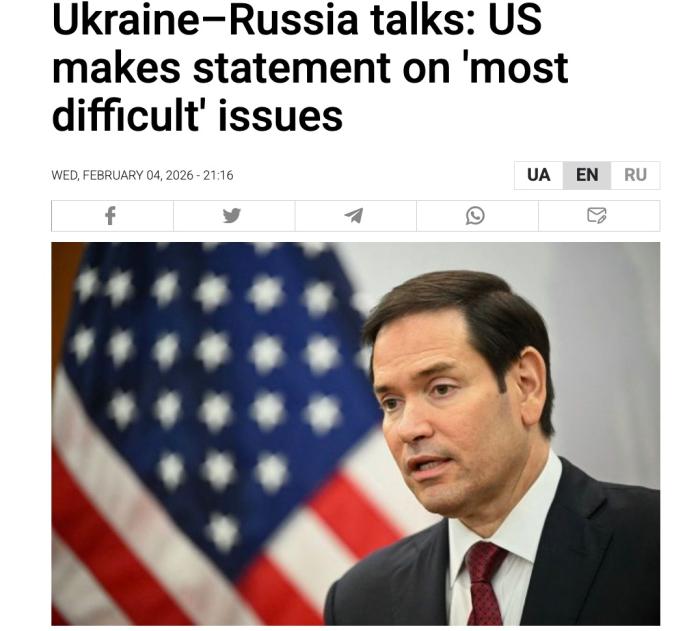 中新網(wǎng)2月5日電 綜合RBC-烏克蘭通訊社等外媒報(bào)道,由俄羅斯、美國、烏克蘭三國代表組成的安全問題工作組4日在阿聯(lián)酋首都阿布扎比舉行新一輪會談。美國國務(wù)卿魯比奧表示,會談已取得一定進(jìn)展,但最棘手問題仍未解決。