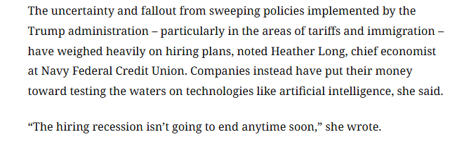 報(bào)道還援引美國(guó)海軍聯(lián)邦信用合作社(Navy Federal Credit Union)首席經(jīng)濟(jì)學(xué)家希瑟·朗的觀點(diǎn)稱,特朗普政府推行的一系列政策,尤其是關(guān)稅和移民政策,所帶來(lái)的不確定性及后果對(duì)招聘計(jì)劃造成了沉重影響。希瑟·朗認(rèn)為,招聘市場(chǎng)的低迷狀況短期內(nèi)不會(huì)結(jié)束。