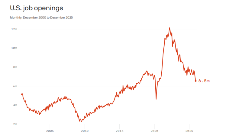 美國(guó)《國(guó)會(huì)山報(bào)》援引美國(guó)勞工統(tǒng)計(jì)局的數(shù)據(jù)報(bào)道稱,美國(guó)2025年12月份的職位空缺數(shù)量為650萬(wàn)個(gè),呈下降趨勢(shì),較上年同期減少了96.6萬(wàn)個(gè)。