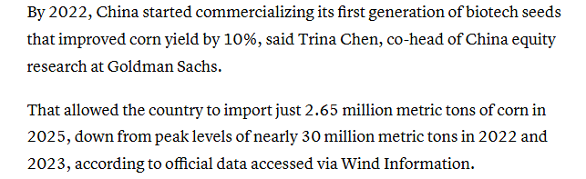 報(bào)道還稱,中國(guó)在農(nóng)業(yè)研究與開(kāi)發(fā)方面投入巨大,2019年至2021年其公共部門在這方面的支出大約是美國(guó)的兩倍。報(bào)道援引高盛中國(guó)股票研究部聯(lián)席主管的觀點(diǎn)稱,到2022年,中國(guó)已開(kāi)始將第一代生物育種產(chǎn)業(yè)化應(yīng)用,這些種子使玉米產(chǎn)量提高了10%。報(bào)道還援引萬(wàn)得資訊獲得的官方數(shù)據(jù)稱,這使得中國(guó)在2025年的玉米進(jìn)口量?jī)H為265萬(wàn)噸,遠(yuǎn)低于2022年和2023年近3000萬(wàn)噸的峰值水平。