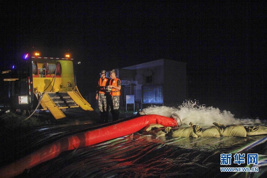 7月13日,在湖北省石首市沙灘子故道,武警第二機動總隊某支隊官兵利用大型龍吸水裝備連夜進行排澇作業(yè)。新華社發(fā)(岳小東攝)