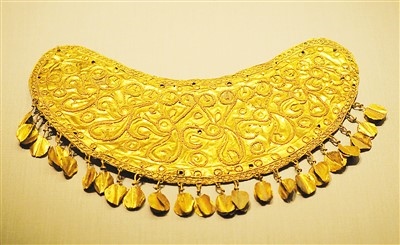 展廳里有不少光彩照人的漢代金飾品,體現(xiàn)了多元文明的融匯。一套出土于鄂爾多斯的金鑲貝玉首飾,由長(zhǎng)方形鹿紋金飾牌、方形嵌蚌金串飾、包金玉佩等組成,其中的鹿紋是典型的草原風(fēng)格紋飾,嵌蚌及其周?chē)倪B珠紋工藝則具有波斯等西方文明的工藝特征。一塊出土于通遼的金飾牌,是薩滿(mǎn)主持祭祀活動(dòng)時(shí)佩戴的飾件,中間雕有一高鼻深目、頭戴尖頂帽的女性,兩側(cè)各有一只怪獸,與西伯利亞地區(qū)出土的雙獅守護(hù)圣樹(shù)金飾牌極為相似。