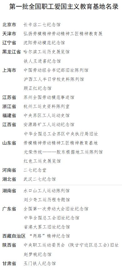 第一批全國職工愛國主義教育基地包括北京市長辛店二七紀念館、黑龍江省鐵人王進喜紀念館、上海市中國勞動組合書記部舊址陳列館、廣東省全國第一次勞動大會舊址紀念館、陜西省中央職工運動委員會(陜甘寧邊區(qū)總工會)舊址等27家單位。旨在進一步加強紅色工運資源的保護挖掘和宣傳利用,引領各級工會努力把紅色工運資源建設成為開展黨史學習教育的重要陣地,打造成愛國主義教育、革命傳統(tǒng)教育、加強職工思想政治引領的生動課堂,團結引導廣大職工群眾更好傳承紅色基因、賡續(xù)紅色血脈、汲取奮進力量。第一批全國職工愛國主義教育基地在中國工運史上影響重大,代表性強、知名度高,現(xiàn)有的設施建設和保護利用較好,符合時代要求,具有較強的示范引領作用。