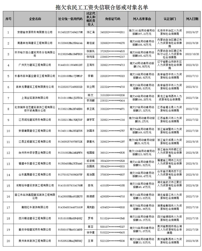 據人力資源和社會保障部公眾號,根據《拖欠農民工工資失信聯合懲戒對象名單管理暫行辦法》(人力資源和社會保障部令第45號),人力資源社會保障部現公布一批拖欠農民工工資失信聯合懲戒對象名單。