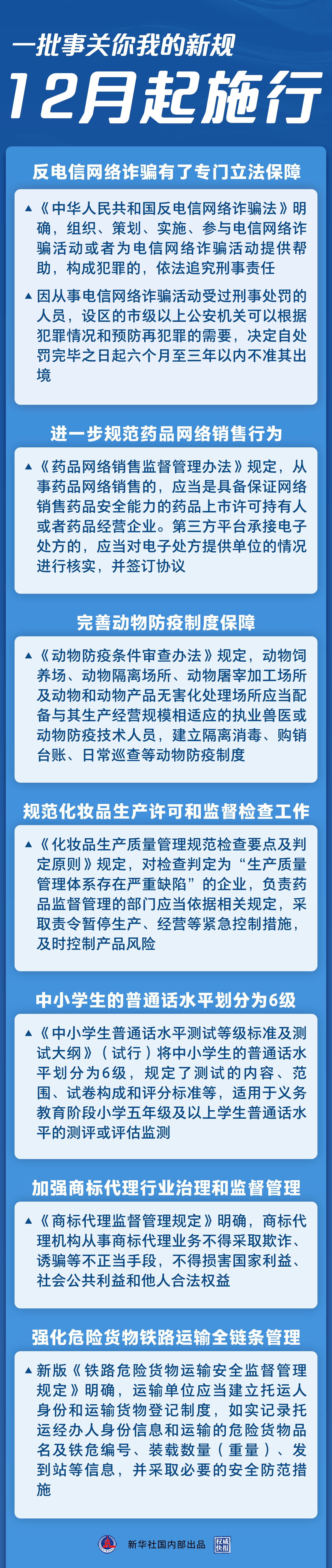 2022年的最后一個月,一批事關你我的新規(guī)開始施行。反電信網絡詐騙有了專門立法保障,中小學生的普通話水平有了規(guī)范標準,藥品網絡銷售平臺責任進一步壓實……法治,為美好生活助力。