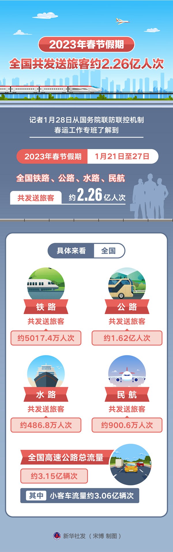 新華社北京1月28日電(記者葉昊鳴、樊曦)記者28日從國務(wù)院聯(lián)防聯(lián)控機(jī)制春運工作專班了解到,2023年春節(jié)假期(1月21日至27日),全國鐵路、公路、水路、民航共發(fā)送旅客約2.26億人次。