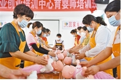 湖北省襄陽市??悼h就業(yè)創(chuàng)業(yè)培訓中心,學員在育嬰師培訓班上練習新生兒護理技能。楊 韜攝(影像中國)