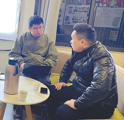 海南分社記者曹文軒(右)在海南省海口復(fù)興城互聯(lián)網(wǎng)信息產(chǎn)業(yè)園黨群服務(wù)中心采訪。張余雪攝