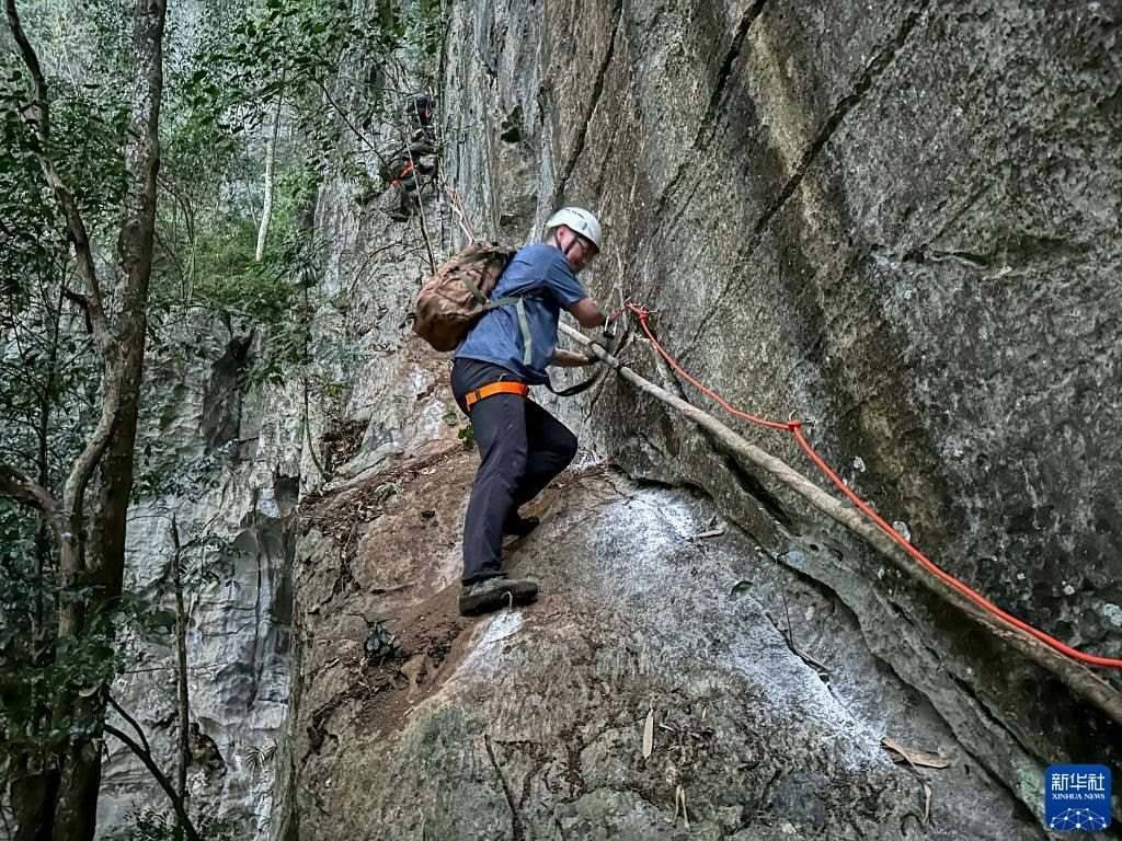3月15日,聯(lián)合科考隊(duì)成員、廣西植物研究所的王斌在科考途中攀爬巖壁。