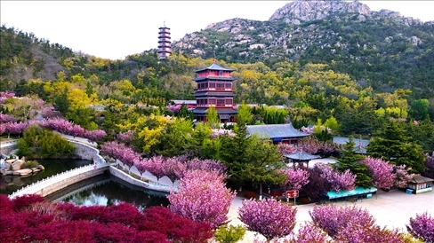 4月27日,山東威海,榮成市石島灣畔赤山山谷櫻花盛開。