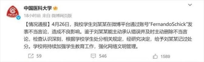 ·在本周中超聯(lián)賽的大連人vs成都蓉城的比賽后,兩隊的球迷出現(xiàn)了一些沖突。有球迷發(fā)現(xiàn)一名大學(xué)生在網(wǎng)上用5.12地震來攻擊刺激成都球迷,該生所屬中國醫(yī)科大學(xué)通報,給予其記過處分。
