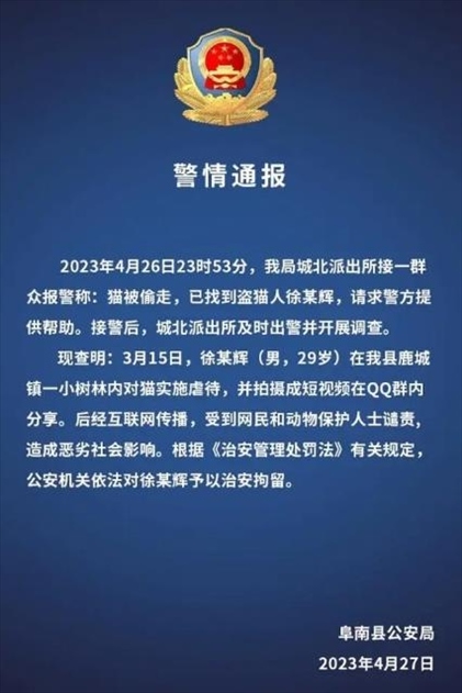 ·網(wǎng)紅偷貓后在小樹林虐殺,并拍短視頻在網(wǎng)上分享,警方通報:依法予以治安拘留!
