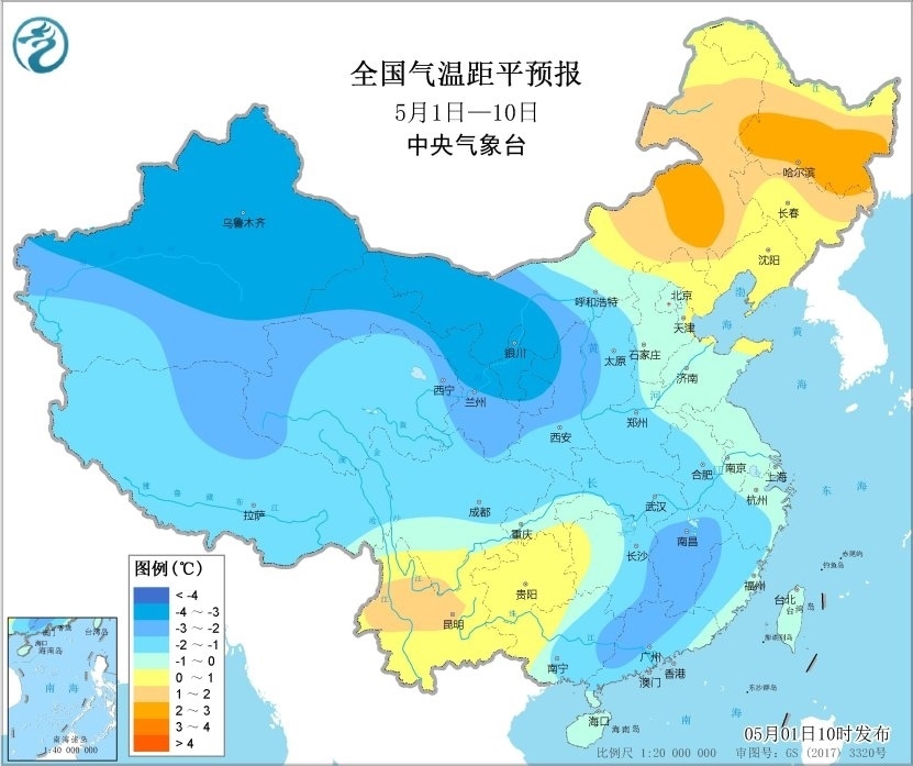 未來10天,除內(nèi)蒙古中東部、東北地區(qū)及云貴高原平均氣溫較常年同期偏高1℃左右外,全國(guó)其余大部分地區(qū)平均氣溫較常年同期偏低1~2℃,其中新疆、甘肅、內(nèi)蒙古西部等地的部分地區(qū)偏低3℃以上。