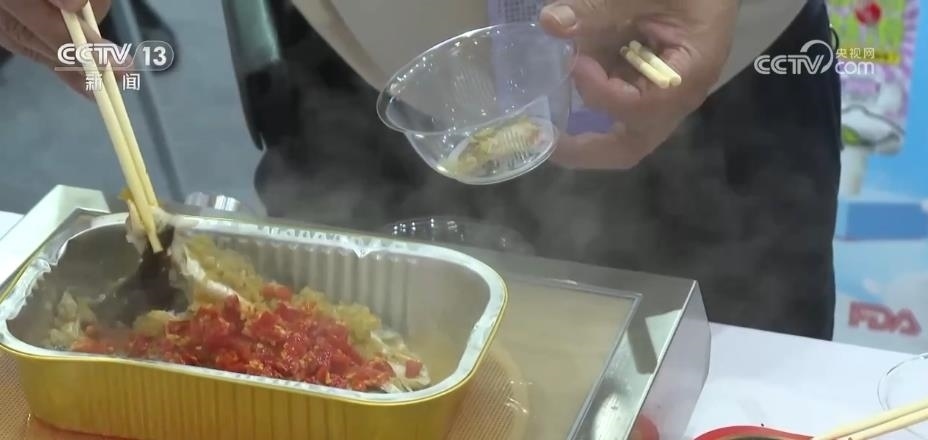最受歡迎的莫過于預(yù)制菜的展位,熱辣的川菜、清淡的粵菜、精致的中式點(diǎn)心,還有各地的特色小吃,各種菜品應(yīng)有盡有。一加熱,香氣四溢,引來不少外國(guó)客商試吃。
