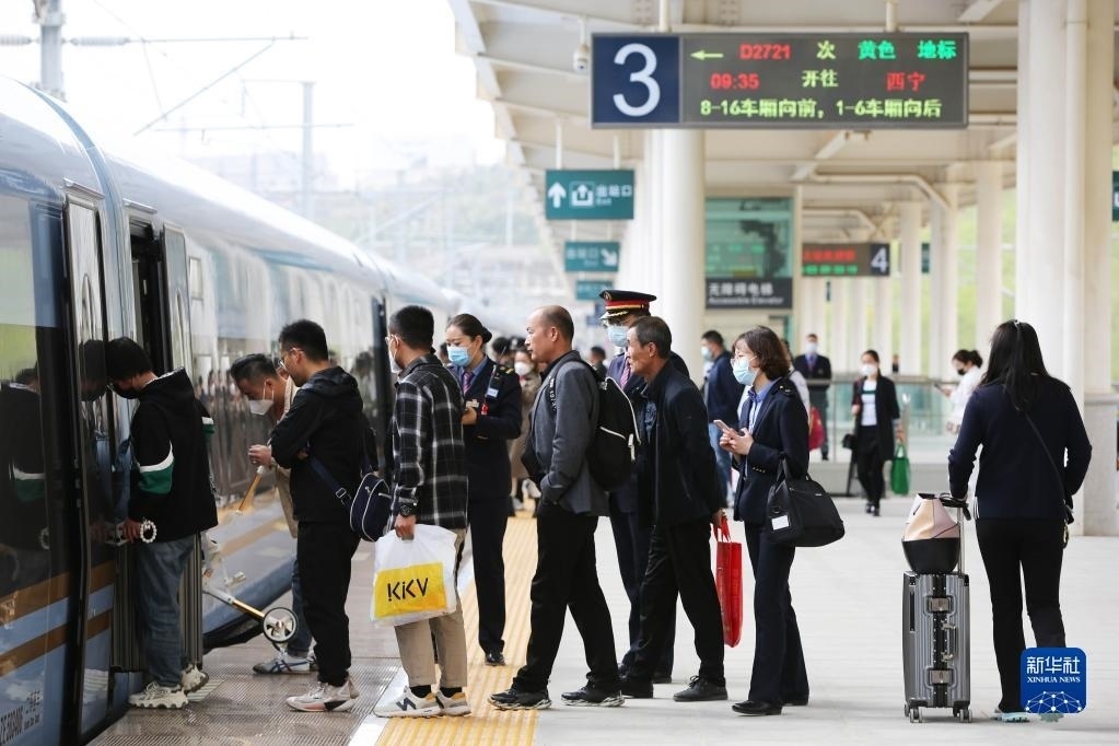 5月3日,旅客在南京火車站乘車出行。
