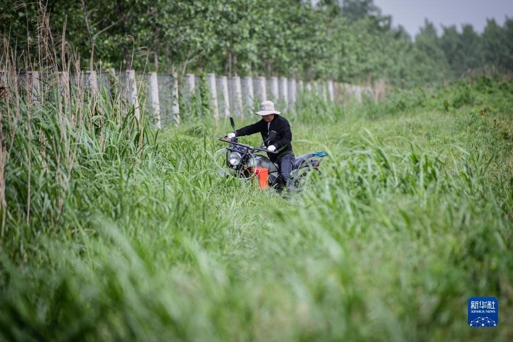 4月29日,在石首麋鹿國家級自然保護區(qū),巡護員王傳軍騎車在齊腰高的野草中巡邏。