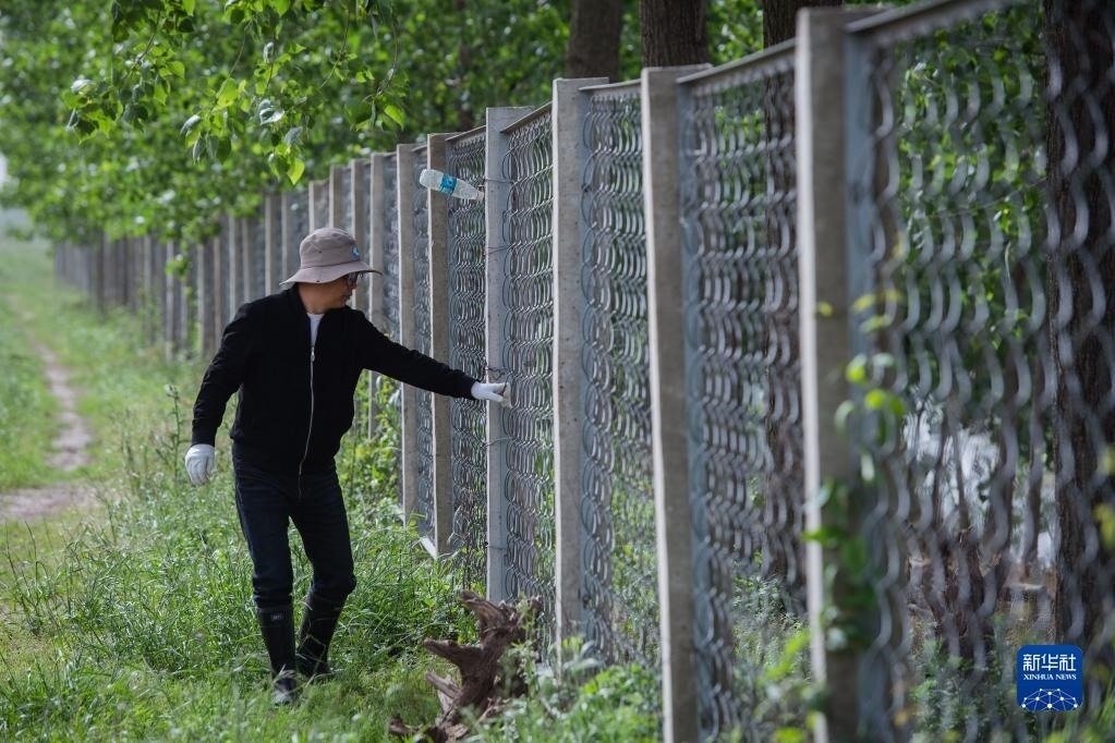 4月29日,巡護員王傳軍在石首麋鹿國家級自然保護區(qū)檢查鐵絲網(wǎng)。