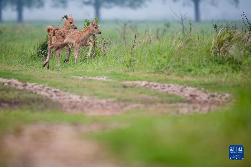 4月28日,幾頭幼鹿跟隨麋鹿群在石首麋鹿國家級自然保護區(qū)內(nèi)活動。