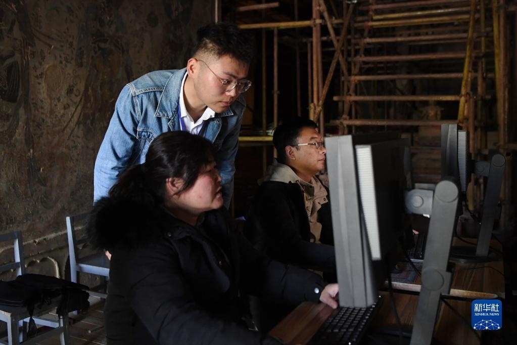 敦煌研究院文物數(shù)字化保護(hù)團(tuán)隊(duì)圖像采集人員熊業(yè)騰(中)和同事在洞窟內(nèi)查看剛剛采集到的圖片(4月25日攝)。
