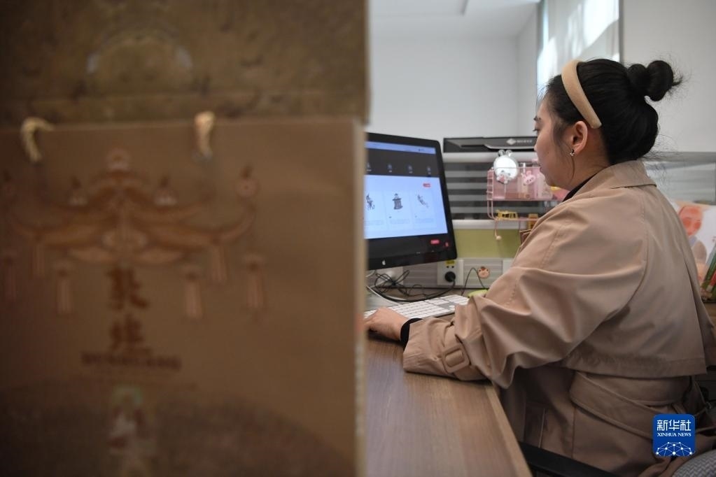 敦煌研究院文物數(shù)字化保護(hù)團(tuán)隊(duì)創(chuàng)意營銷人員廖雪婷在整理文創(chuàng)產(chǎn)品(4月25日攝)。