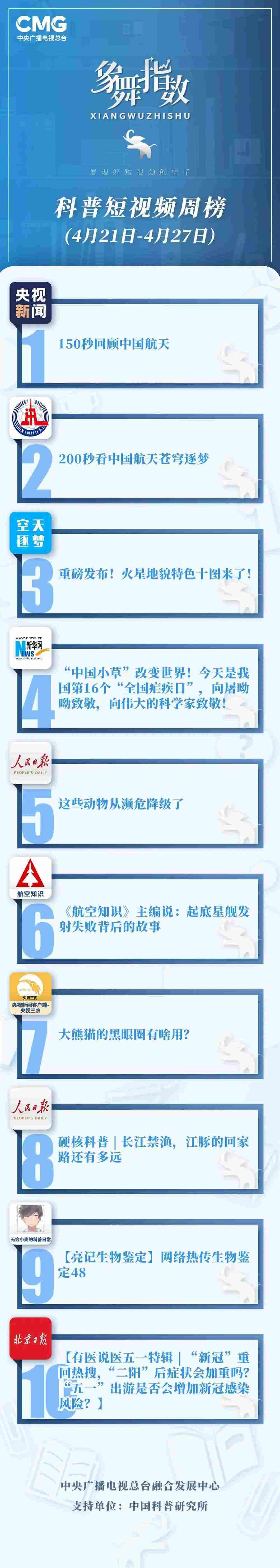 中央廣播電視總臺“象舞指數(shù)”評議品牌,推出科普短視頻周榜、總臺科普短視頻周榜。在2023年4月21日-4月27日,值得注目的內(nèi)容有: