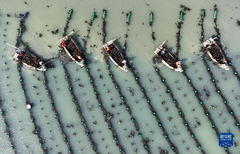 5月8日,在山東省榮成市愛倫灣海域海帶養(yǎng)殖區(qū),漁民采收海帶(無人機(jī)照片)。