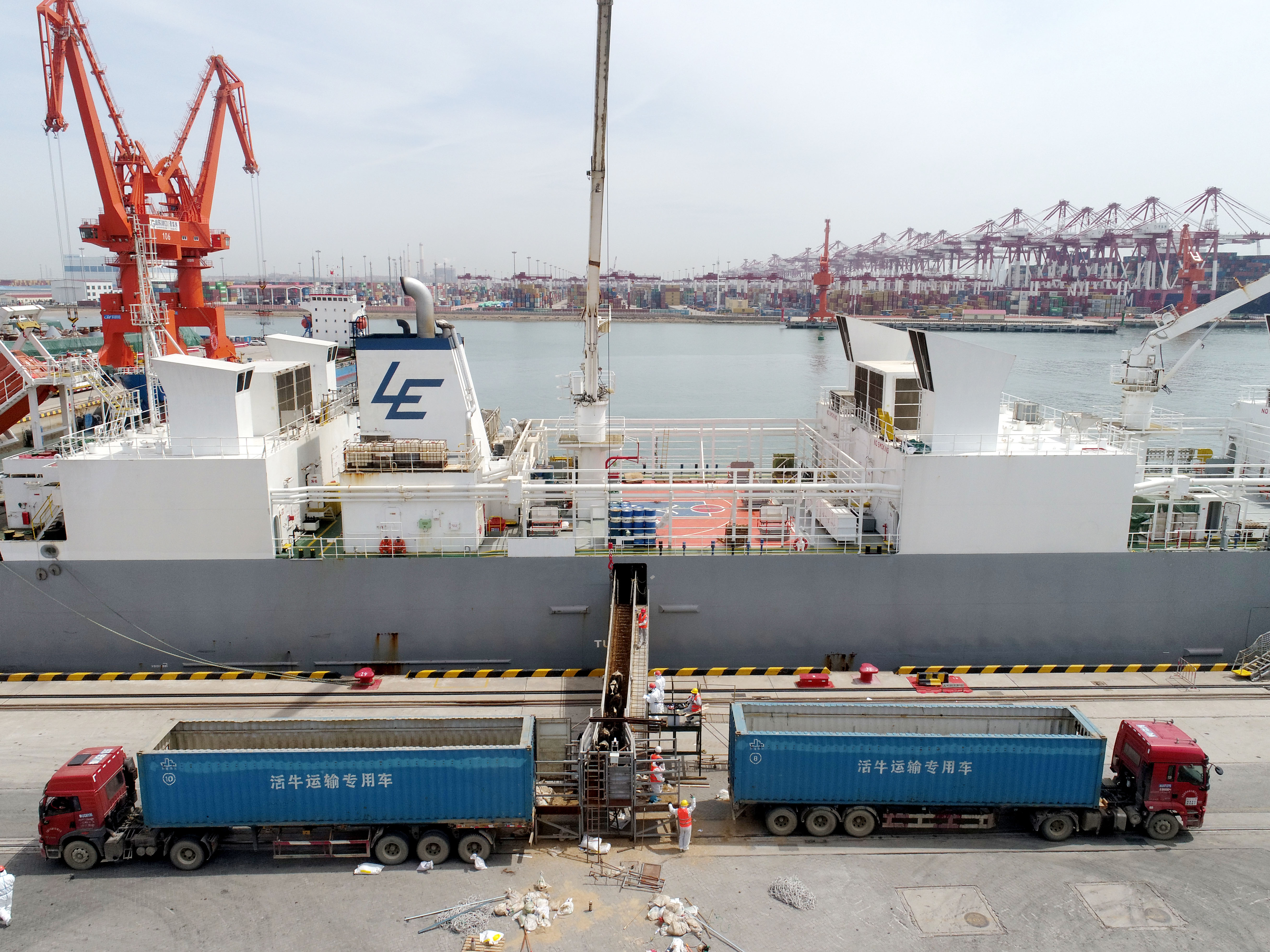 5月8日,在山東港口青島港前灣集裝箱碼頭,3000余頭活牛卸船轉(zhuǎn)運(yùn)。