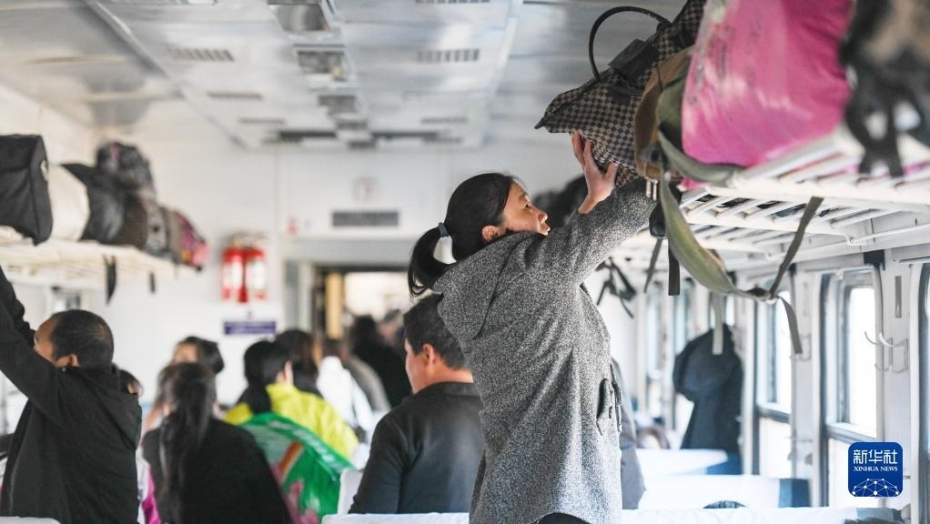 在K5151次列車車廂中,一位乘客將行李放置在行李架上(5月6日攝)。