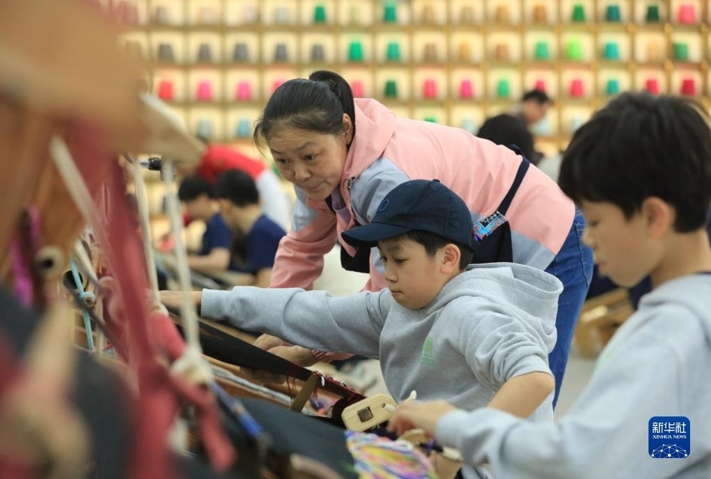 5月12日,來(lái)自上海包玉剛實(shí)驗(yàn)學(xué)校的學(xué)生在張家界市武陵源區(qū)乖幺妹土家族織錦基地學(xué)習(xí)體驗(yàn)土家族織錦非遺技藝。