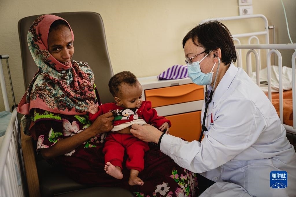 5月9日,在厄立特里亞首都阿斯馬拉的奧羅特醫(yī)院,醫(yī)療隊兒科醫(yī)生張春燕(右)為小朋友聽診。