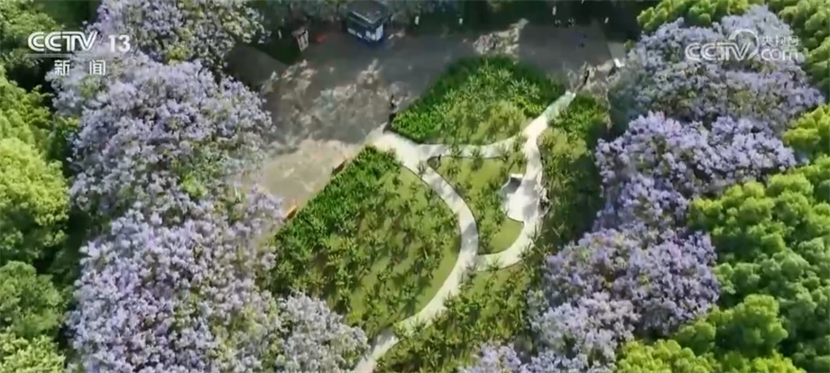 五月的山城重慶,眼下正是藍花楹盛放的季節(jié),在重慶九龍坡區(qū)彩云湖公園,一叢叢藍紫色的藍花楹開得正艷,鈴鐺形的花朵層層疊疊、錯落有致。從空中俯瞰,近20株身姿挺拔的藍花楹圍成一圈,宛如一個碩大的紫色“愛心”,為公園增添了別樣的浪漫氣息。