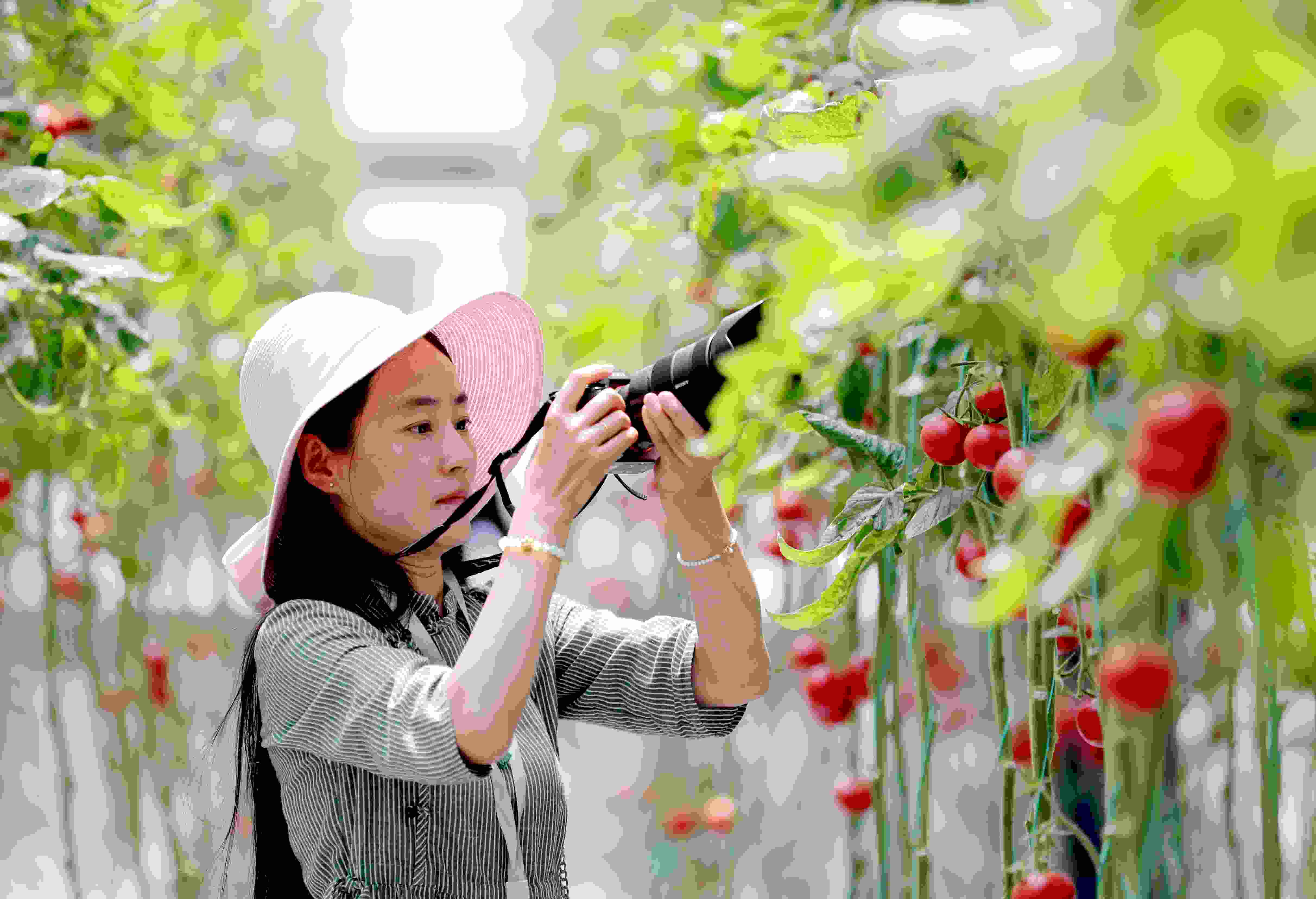 5月15日,游客在青島市即墨區(qū)北安街道一家智慧農(nóng)場(chǎng)體驗(yàn)采摘樂(lè)趣。