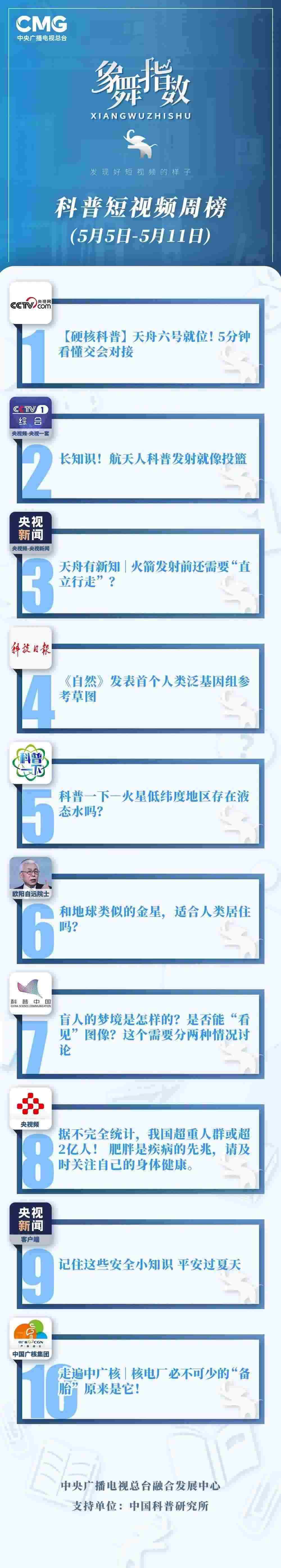 中央廣播電視總臺“象舞指數(shù)”評議品牌,推出科普短視頻周榜、總臺科普短視頻周榜。在2023年5月5日-5月11日,值得注目的內(nèi)容有: