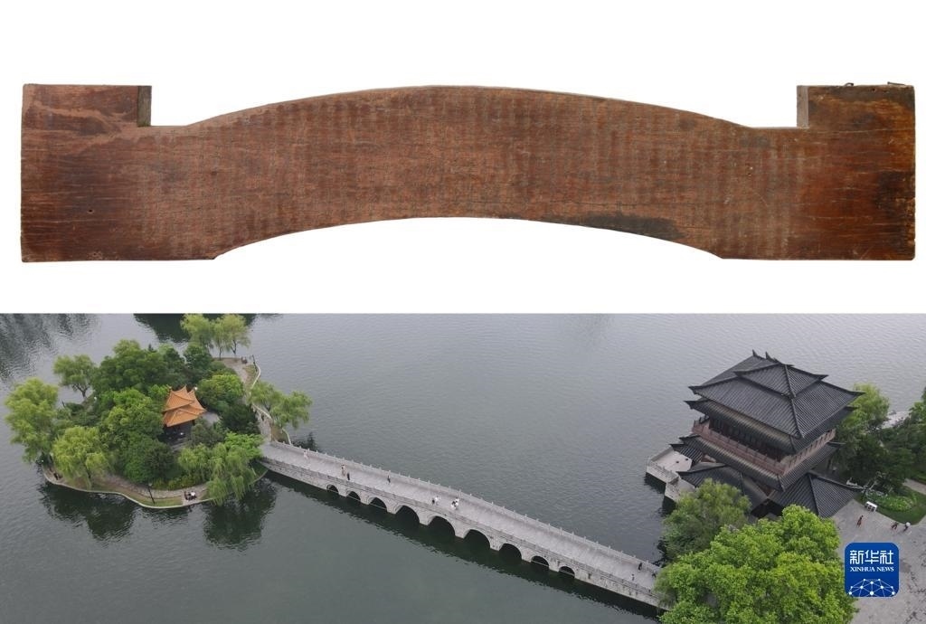 這是一張拼版照片,上圖為:《逍遙津木刻枋》,現(xiàn)收藏于安徽博物院(新華社發(fā),吳艷攝);下圖為:5月17日拍攝的位于安徽省合肥市的逍遙津公園(無人機照片,新華社記者張端攝)。